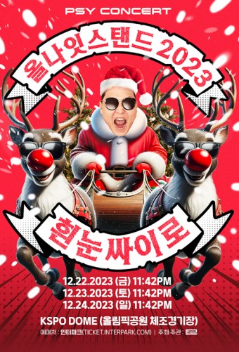 하 드디어 이분이 나왔네요. 대한민국 사람이라면 강남스타일 모두 아실것으로 생각되고, 이 말은 즉 싸이님도 모두 아실것으로 생각됩니다. 여름축제, 대학축제, 연말축제 등 모든 축제와 콘서트의 최강자라고 생각되는데요. 콘서트 제목만봐도 흰눈싸이로인데 그냥 콘서트 분위기가 어떨지 예상이 됩니다. 아마 싸이님의 콘서트는 예매난이도가 상당할 것으로 생각되는데 취소표도 많이 나오는만큼 매일 도전하신다면 꼭 성공할것으로 생각됩니다.